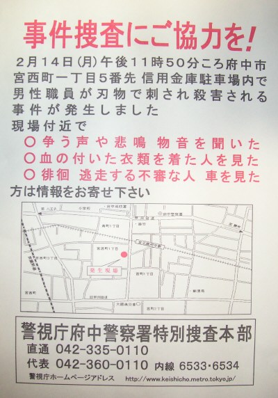 府中駅に戻ってきたら、改札のところに人がいっぱいいて14日の事件のビラを配ってました。